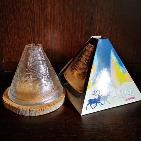 Materiaali: Kirkas, jämäkkä lasi, jossa on karhea, jäätä muistuttava pinta jossa kuvia poroista.