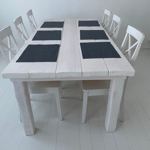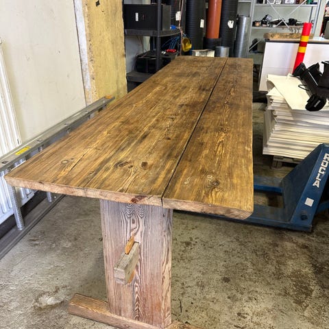 Kaunis puupöytä metallijaloilla. Tuolit kuuluu kauppaan.