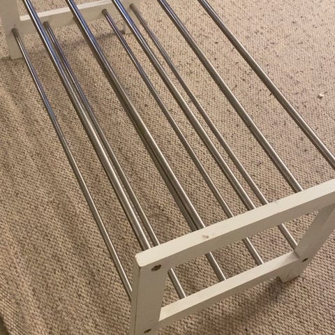 IKEA TJUSIG kenkähylly, jossa kaksi tasoa. Päädyt ja runko ovat valkoista materiaalia ja tasot muodostuvat metallisista tangoista.