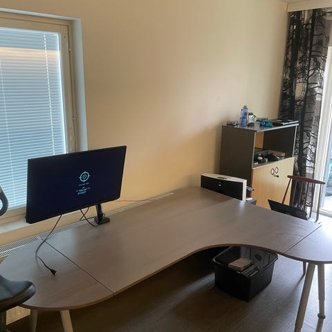 Martela sähkötyöpöytä. Kulmamalli n. 150x150+ 60 cm lisäosa. 3 jalkainen, jonka päällehän voi laittaa minkälaisia tasoja vaan.