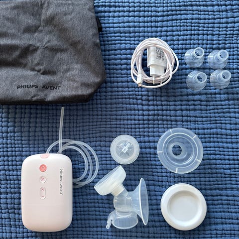 Philips Avent sähkökäyttöinen rintapumppu. Mukana tulee pumppuyksikkö, rintasuppilo, maitosäiliö/pullo mitta-asteikolla sekä virtalähde ja letkut. Laitteessa on ohjauspaneeli, josta voi säätää imutehoa. Tähän malliin ostettavassa uutena myös varaosio, kuten uusi pullo ja rintaosa, jolloin tuotteesta saa "kuin uuden".