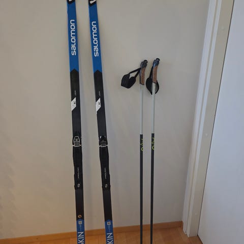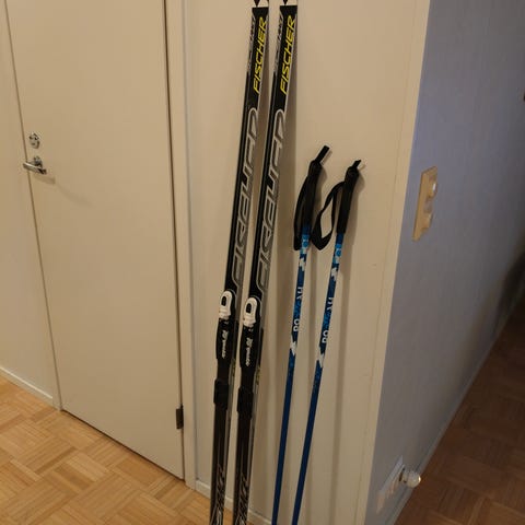 Hiihdettävässä kunnossa pieneksi jääneet sukset ja sauvat. Palvelleet hyvin vuosia vähäisellä käytöllä, pikaluistoa vain laitettu lisää pohjiin eikä muuta näille tehty. Mieluusti vain nouto.