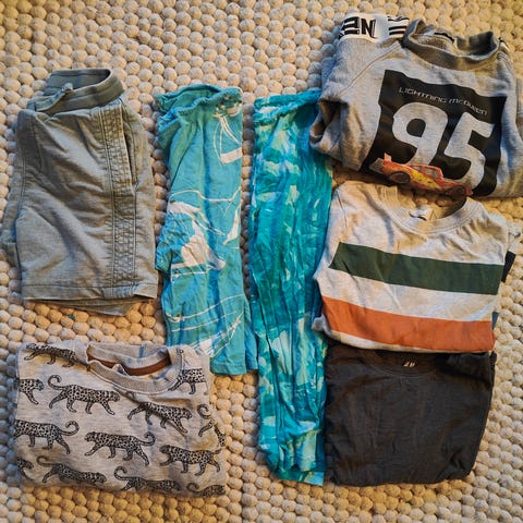 Mukana mm. 3 PH yöpaitasettiä, collegepaitoja, housuja, teeppareita. Pääasiassa merkkinä H&M.