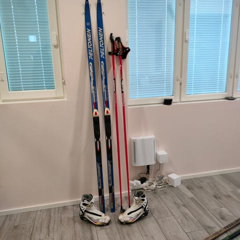 Sukset 170cm ja sauvat 135cm + monot koko 37 (monot voin myydä myös erikseen). Yhteishinta kaikille 25e, erikseen sukset + sauvat 15e ja monot 15e. Nouto Riihimäen Koivistonmäestä 😊 Maksu Mobilepaylla.