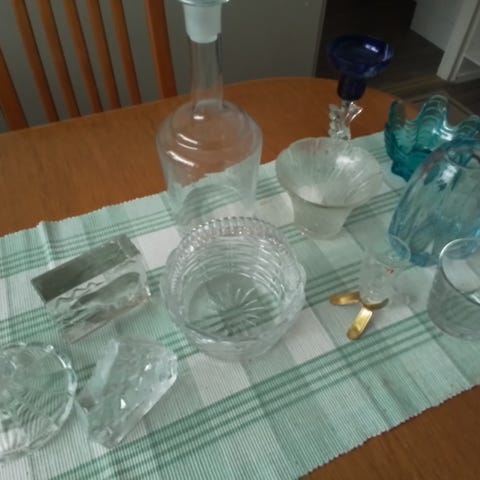 Sekalainen kokoelma lasiesineitä. Kokoelmassa on useita erimuotoisia ja -kokoisia kirkkaasta lasista valmistettuja esineitä, kuten pieniä kulhoja, kynttilänjalkaa muistuttavia kappaleita sekä lasinen eläinhahmo. Esineet on numeroitu erikseen, ja niitä voidaan käyttää esimerkiksi sisustusesineinä tai kattauksen osana. Tarkemmat mitat ja kappalemäärät voi tarkistaa myyjältä.