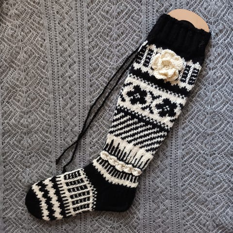 Pitkävartiset sukat 7velj. ja Housen Onni langasta kokoa 38/39. Varren pituus lattiasta mitattuna 49cm ja terän pituus 24cm.
