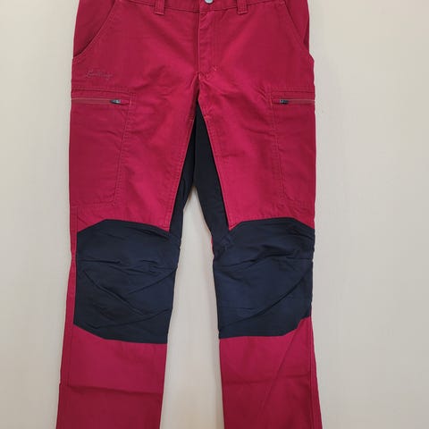 Punaiset ulkoiluhousut. Säädettävä vyötärö. Lahkeen sisäpituus 72 cm ja vyötärö noin 89 cm. Materiaali 100% puuvillaa, polvien kohdalla materiaali 92% nylon ja 8% spandex