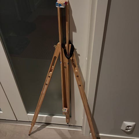 Puinen maalausteline kolmijalka. Telineessä on säädettävä korkeus sekä ylä- ja alakiinnikkeet maalauksille tai piirustusalustoille. Soveltuu esimerkiksi kangas- tai levymaalausten pitämiseen pystyssä sisätiloissa. Materiaalina lakattu puu, jalat taittuvat säilytystä ja kuljetusta varten. Kokonaiskorkeus n. 140cm, riippuen säädöstä.