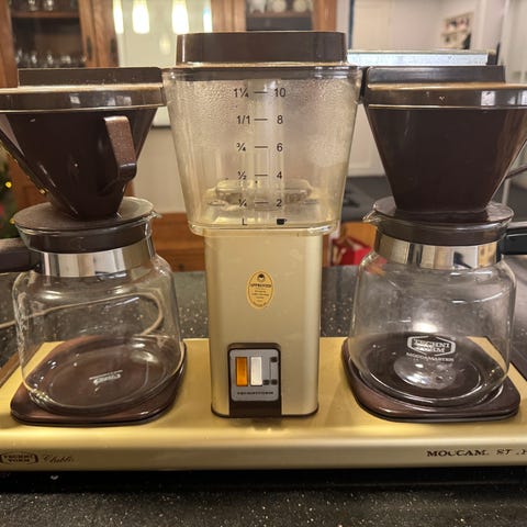 Mattahopeinen perinteinen Moccamaster uuden tieltä. Toimiva ja siisti. Perus käytönjälkeä, kaikki osat ehjiä. Manuaalinen tippalukko toimii.