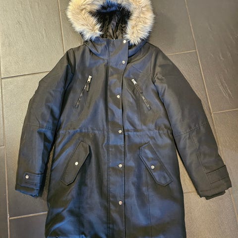 ONLY lämmin, siisti toppatakki tekoturkiskauluksella ja vahvistetuilla kyynärpaloilla. Hihoissa resorit, vetoketjutaskut. Takissa koko M mutta sopii paremmin S- koolle.