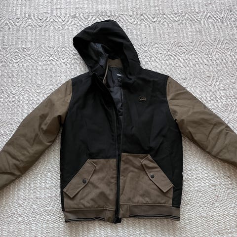 Vans lasten takki, koko n. 164. Unisex-malli. Väri musta, materiaali polyesteri. Takissa on huppu, etuvetoketju ja etutaskut. Hihansuissa joustavat resorit. Sopii arki- ja vapaa-ajan käyttöön talvella. Lämmin pusakka.