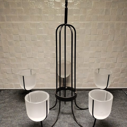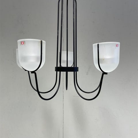 Iittala Alfa tuikkukynttelikkö, jossa on viisi mattavalkoista lasi tuikkukuppia ja musta metallirunko. Kynttelikkö on suunniteltu roikkumaan katosta ja se luo pehmeän valaistuksen tilaan.Kynttelikkö edustaa modernia skandinaavista muotoilua, joka yhdistää yksinkertaisuuden ja toiminnallisuuden. Iittala on tunnettu laadukkaista ja ajattomista design-esineistään.Kynttelikkö on hyvässä kunnossa ilman näkyviä vaurioita tai kulumia.Design Markku Salo
