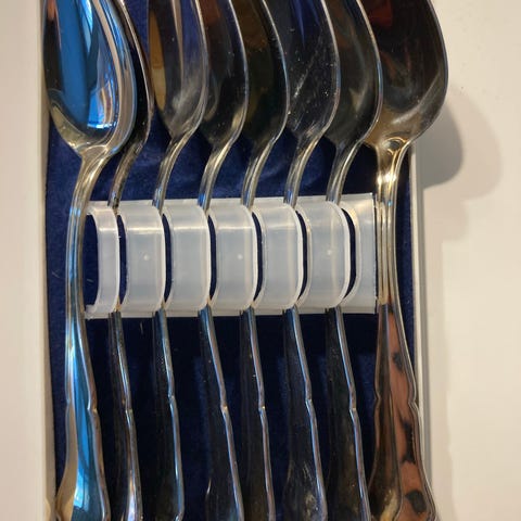 12 kpl hopeisia chippendale kahvilusikoita. Ei kaiverruksia. Olleet käytössä vain pari kertaa.