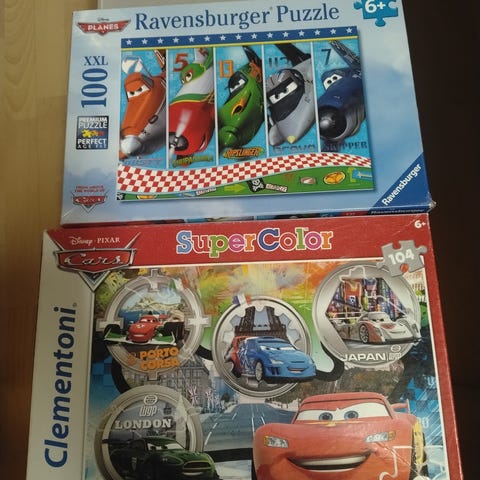 Puisia lasten palapelejä, joissa on erilaisia eläin- ja ajoneuvokuvia. Palat ovat paksuja ja helppoja tarttua. Kaksi näistä on nuppipalapelejä. Keskellä olevasta eläinpalapelistä puuttuu yksi ympyrän muotoinen pala, mutta se ei kokoamista haittaa.