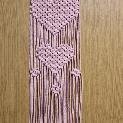 Makrameen väreinä on vaaleanpunainen ja luonnonvalkoinen. Luonnon koivukeppiin tehty.