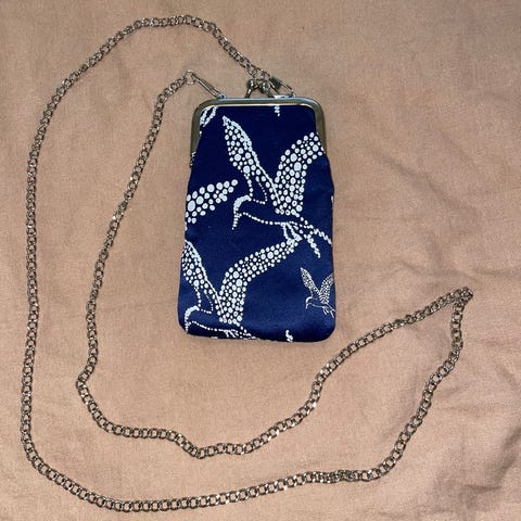 Uusi, hajuton ja ehjä kukkarolaukku: valkoinen vuori ja perhosaiheinen päälliskangas.