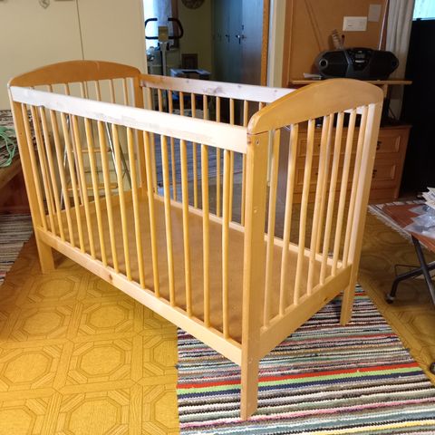Puinen pinnasänky johon tehty uusi etuosa puusta. Patjan saa mukaan.