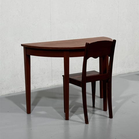 Puolipyöreä 110cm leveä pöytä sekä yksi puutuoli, joka sopii pöydän kanssa yhteen (pieni väriero).