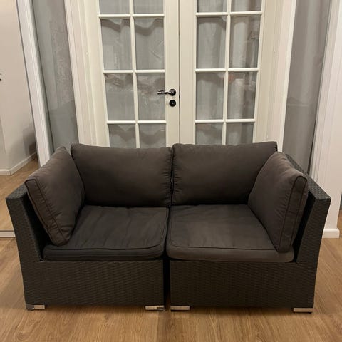 Harmaa polyrottinkinen terassi- / parvekesohva säilytystilalla. Sohvan divaaniosia voi käyttää molemmin puolin joko säilytystilana tai divaaniosina/erillisinä lisäistuimina. Selkänojan keskimmäisen osan saa laskettua halutessaan pöytätasoksi. Sohvatyynyt olleet tummanharmaat, mutta auringossa väri haalistunut.