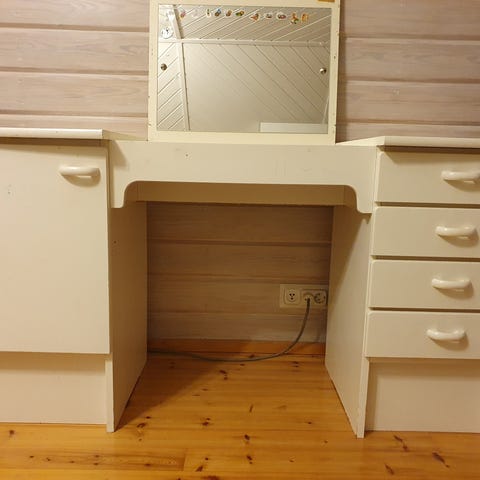 Täyspuinen meikkipöytänä / kirjahyllynä ollut. Painaa varmasti n. 20-30 kg, eli erittäin tukeva. Vetonupikat puuttuu parista laatikosta.