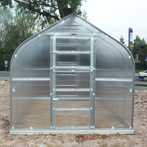 Kasvihuoneessa on raskas galvanoitu teräsputkirunko 20x40 mm 1 mm:n materiaalivahvuudella ja 6 mm UV-suojatut polykarbonaattikennolevyt. Nämä takaavat kasvihuoneelle pitkän käyttöiän ja hyvän säänkestävyyden. Kaareva muoto ohjaa lumen ja tuulen tehokkaasti sivuille.