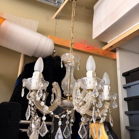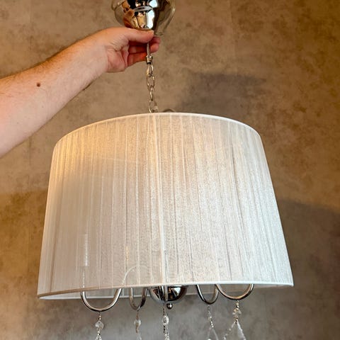 Valaisimessa on koristeelliset kristalliketjut. Toimiva ja siistikuntoinen.