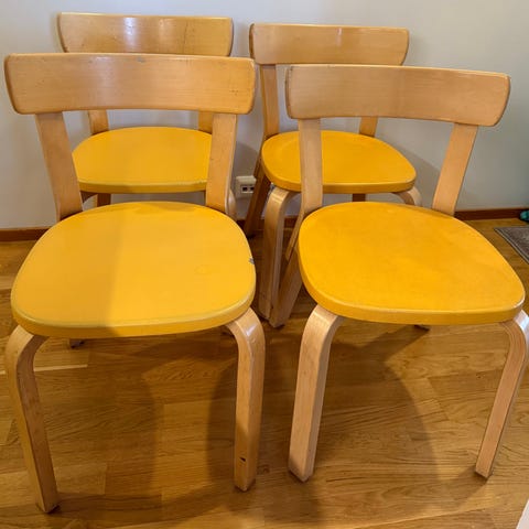 Myynnissä kuvissa esiintyvät tuolit. Pinnoissa on valitettavaa käytön jälkeä/kulumaa