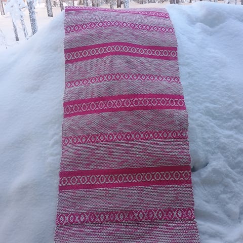 Vadelmainen, vaaleanpunainen matto. Uusi, itse kudottu. Leveys 80cm, pituus 255cm.