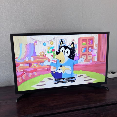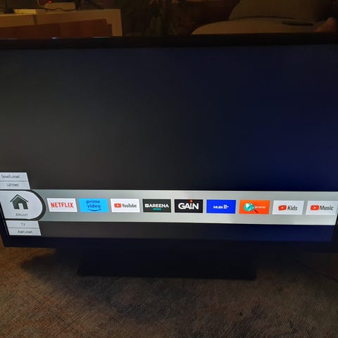 Samsung 32” TV, lasinen TV-taso, soitin ja kaiuttimet