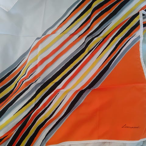 Hyvässä kunnossa oleva vihreä huivi. Päädyssä olevista langoista muutama solmittu.