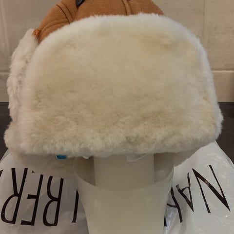 Uudenveroinen kunto, paitsi että "nauhat" jotka solmii hatun ylös, irronneet. Ei haita käyttöä, läpät pysyy hyvin ylhäällä taitettuna, jos haluaa käyttää niinpäin.