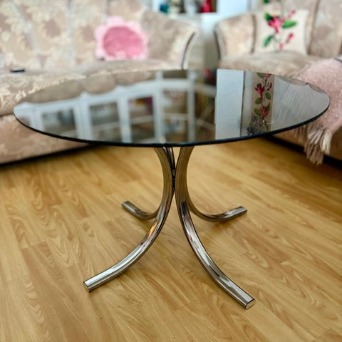 Lasinen ovaalinmuotoinen sohvapöytä, jossa on kirkas lasikansi ja puunsävyinen alempi taso. Käytön jälkiä on, kuvassa näkyy mutta pöytä on tukeva ja hyvä, myös lasi paksu ja kestävä.