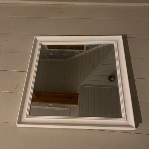 82 cm x 82 cm puinen valkoinen peili. Takana rautalankapidike.