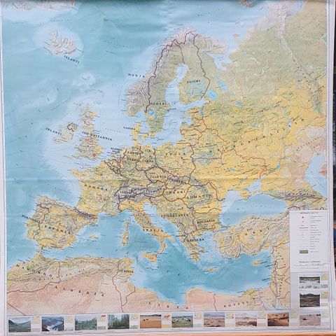 Valtioiden rajat ja nimet sekä merkittävät maastonimet ja vesistöt on merkitty karttaan.