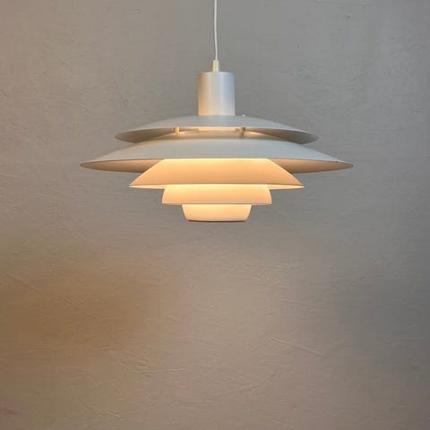 Moderni tanskalainen vintage-riippuvalaisin klassisella monivarjostinjärjestelmällä.Lamppu on suunnitellut tanskalainen valaistusyritys Jeka 1960-luvulla.Jeka on osa tanskalaisen modernin muotoilun perinnettä, johon kuuluvat nimet kuten Jo Hammerborg (Fog og Mørup), Bent Karlby (Lyfa), Svend Middelboe (Nordisk Solar) ja monet muut, jotka kaikki työskentelevät monivärijärjestelmän parissa. Tämä järjestelmä kehitettiin ensimmäisen kerran kuuluisan arkkitehdin Poul Henningsenin (Louis Poulsen) toimesta 1900-luvun alussa.Käytön merkit.Se käyttää "tavallista" E27-lamppua ja on käyttövalmis.