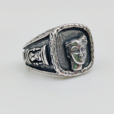 Erittäin tukeva Bognerin vintage-sormus, mustalla onyxilla.Massiivinen ja näyttävä sormus Bogner-merkiltä, valmistettu hopeasta ja asetettu suurella cabochoniksi leikatuslla mustalla onyxillä. Sormus on raskas ja tuntuu erittäin tukevalta. Sormuksen sivuun on kaiverrettu kirjain B, Bognerin merkki.Sormus on vähän käytetty ja on erittäin hyvässä kunnossa. Leveän pannan ja korkean asetelman ansiosta tällä sormuksella on vahva ilme.Yksityiskohdat:Materiaali: hopeaMerkki: BognerRingkoko: 56Renkaan yläreunan leveys: noin 15 mmRenkaan alaosan leveys: noin 5 mmSteen:Musta onyxHiontamuoto: cabochonKiven mitat: noin 11 mm läpimitta × 7 mm korkeusArvioitu karaattipaino onyxille: noin 4,5–5,0 ct (laskettu mittojen ja tiheyden perusteella, arvio)Kaikki korut pakataan huolellisesti korurasiaan ja lähetetään seurantatunnuksella.