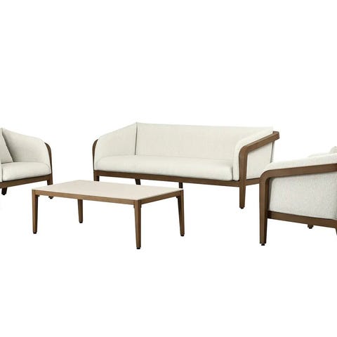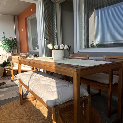 Settiin sisältyy 2‑istuttava sohva, kaksi nojatuolia sekä kaksi erikokoista kahvipöytää, jotka muodostavat yhtenäisen ja käytännöllisen kokonaisuuden niin terassille, parvekkeelle kuin puutarhaan.