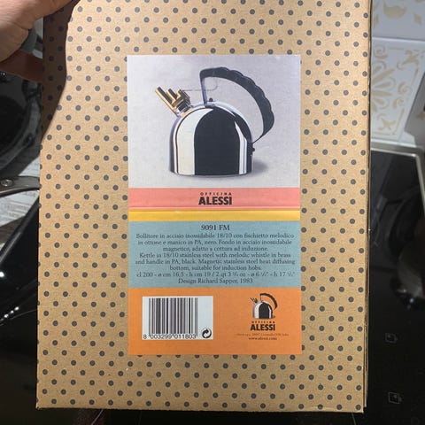 Tämä on Alessi 9090 -espressokannu, ruostumattomasta teräksestä ja ruskealla bakeliittikahvalla.Se oli Alessin ensimmäinen kahvinkeitin, ja sen suunnitteli Richard Sapper.Hän on voittanut Compasso d'Oro -palkinnon vuonna 1979 ja on esillä New Yorkin MoMA:n pysyvässä kokoelmassa.Esittelee patentoidun vivun sulkumekanismin ja tippumaan estävän nenän.Laajennetun pohjan tarkoituksena on optimoida lämmön jakautuminen, ja se soveltuu myös induktioliesille.Toimitetaan ilman alkuperäistä pakkausta.