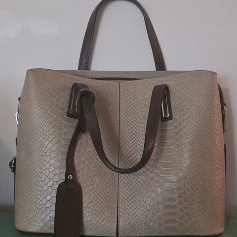 Elegantti, italialainen laukku irrotettavalla olkahihnalla. Valmistettu vettä ja tahroja hylkivästä nailonista, kahvat nahkaa, sisällä piilotasku ja kiinteä avainhihna. Mitat 25 x 18 x 15 cm.