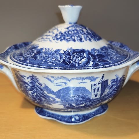 Arabia ruskea maisema soppakulho, jossa on kaunis maisemakuviointi. Kulho on valmistettu posliinista ja siinä on koristeellinen kansi.