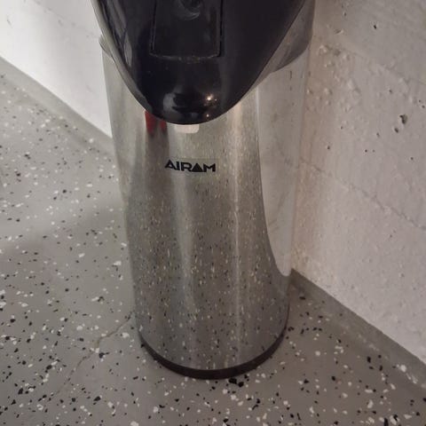 Sympaattinen, kätevä pieni puolen litran teräksinen Airam termoskaadin, jonka saa pestä tiskikoneessa. Myynnissä on käyttämätön kannu pakkauksessaan joten sopii vaikka lahjaksi.