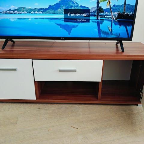 Myydään tv-taso, leveys 125cm, välitilan korkeys 19cm, pyörät alla, tukevaa tekoa.