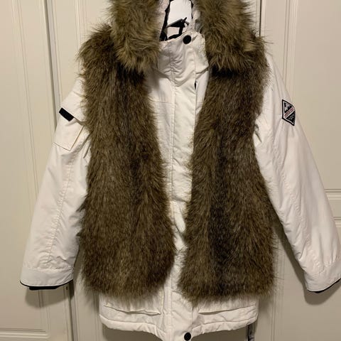 Cubus tyttöjen lämmin talvitakki, koko 158cm.Väri valkoinen ja materiaali polyesteri. Takissa on hupullinen malli, jossa irrotettava tekoturkisreunus, vyötäröllä kiristys ja taskuja edessä ja hihoissa.