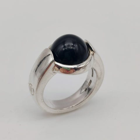 Säädettävä hopeasormus hollantilaiselta hopeaseppä Menno Meijeriltä, toteutettu ilmeisen kubistisessa muotoilussa.Yläosa koostuu tiukasti rakennetusta geometrisestä tilavuudesta, joka kohoaa selvästi korkeammalle sormen päällä ja antaa suunnittelulleen veistoksellisen luonteen. Renkaan yläosa on leveä ja kapenee asteittain alaspäin, mikä takaa mukavan käyttökokemuksen huolimatta sen voimakkaasta muotoilusta.Sormus on säädettävä ja siksi sopiva eri sormenkokoille.Yksityiskohdat:Yläpinnan mitat: noin 1,6 × 1,5 cmKorkeus yläreunaan: noin 9 mmYläreunan renkaan leveys: noin 8 mmLeveys renkaankannattimen alareunassa: noin 5 mm.Sormuksen koko: säädettäväGekeurd met:FM2 (Menno Meijerin mestarimerkki)Hopeapitoisuus: ei hyväksytty, testattu hopeaksiKaikki korut pakataan huolellisesti korurasiaan ja lähetetään seurantatunnuksella.