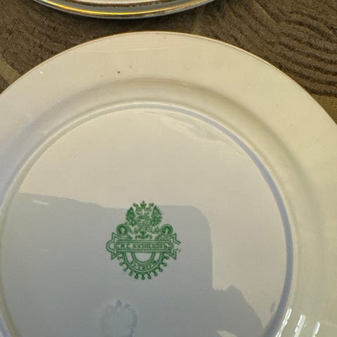 Vaikka hakku sana Kuznetsov mutta tämä ei Kuznetsov.Mutta kuitenkin vanäläiset tsaari aikoina.Yli 💯 vuotta vanhat .Syvät lautaset.Toinen lautasella pieni ,pieni vika/kolhu.Yht.hinta 70€.