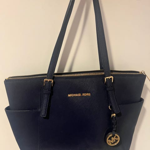 Michael Kors olkalaukku. Säädettävä olkahihna. Laukussa on vetoketjusuljenta ja useita lokeroita sisäpuolella, mukaan lukien korttipaikkoja ja pieniä taskuja pikkutavaroille.