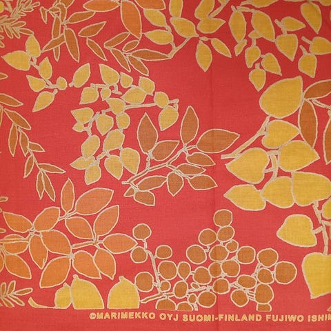 Kankaan värit stemmaavat muuten hyvin toisena kohteena myynnissä olevien Arabian Meri -astioiden kanssa.