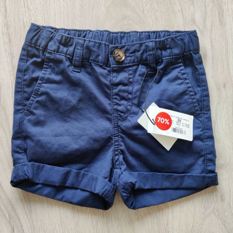 Poikien shortsit, koko 86. Vaaleapohjaiset raidalliset shortsit, joissa tummempi joustava vyötärö ja kiristysnyöri. Sopivat arkeen ja leikkeihin noin 1,5-vuotiaalle lapselle.