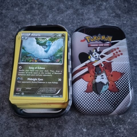 Myydään kuvien mukainen mini-tin rasia täynnä sekalaisia pokemon kortteja joista suurin osa on hieman vanhempia (kelta-reunaisia). Korttien kunnot vaihtelevat, Tini rasia kuuluu hintaan.