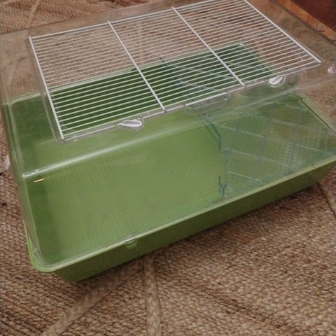 Kääpiöhamsterin häkki ja tarvikkeita: 2 juoksupyörää, ruokakuppi, pesämökki, juomapullo, hiekka astia, puolikas pussi paperikuiviketta, pesuhiekkaa, puolikas pussi ruokaa, juoksuaitaus ja kuljetushäkki